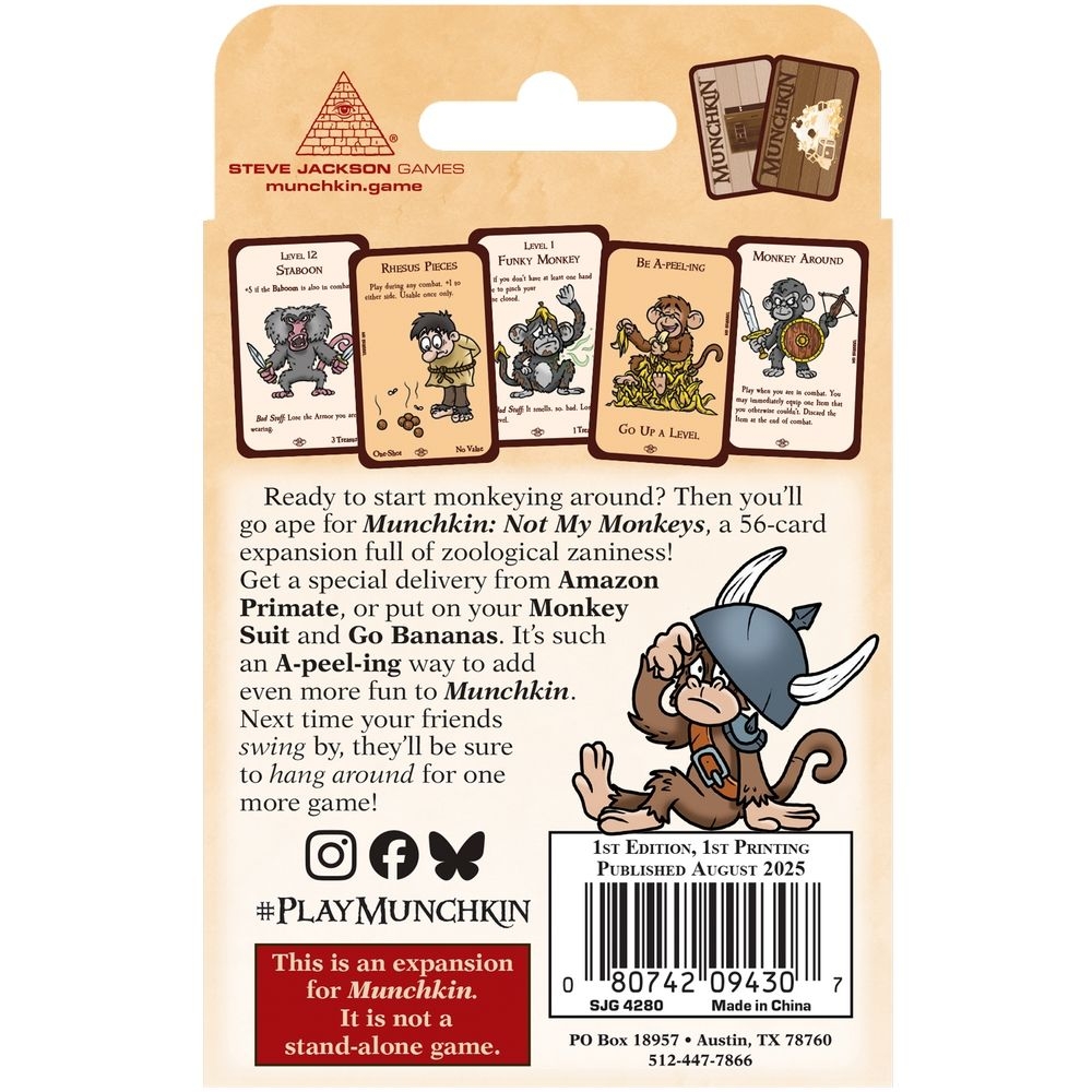 Munchkin: Not My Monkeys is a hilarious and chaotic expansion that injects a dose of simian silliness into the classic Munchkin card game. Developed by Devin Lewis and illustrated by Bas Goverde, this set features 56 brand-new mischievous cards filled with monkey-themed monsters, items, and curses designed to make players "Go Bananas" during their dungeon adventures. It provides more opportunities for backstabbing fellow players and grabbing loot.
