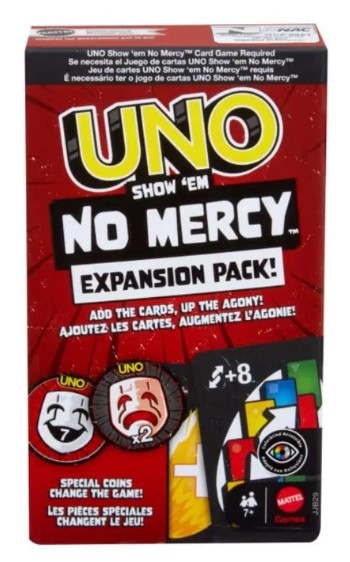 Fans of UNO Show 'em No Mercy game will love this expansion pack -- it includes 24 additional cards that bring extra carnage to the already brutal game, plus special coins that can either save a player or double the pain!