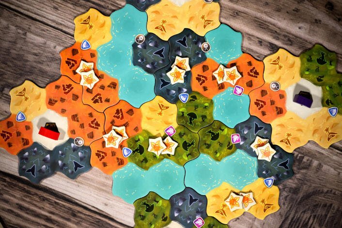 Dewan is a competitive area placement game for 2 to 4 players. Collect Terrain cards and spend them to strategically place your Camps on the Territory. Make the best use of terrain and resources so that you can satisfy the requirements on your Story tiles. Along the way, gather Berries and master Fire to earn additional valuable victory points.