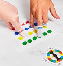 Put the coloured finger sock on, spin the wheel, then place your fingers on the corresponding colour indicated on the mat. Watch as your fingers get as tangled as your limbs!