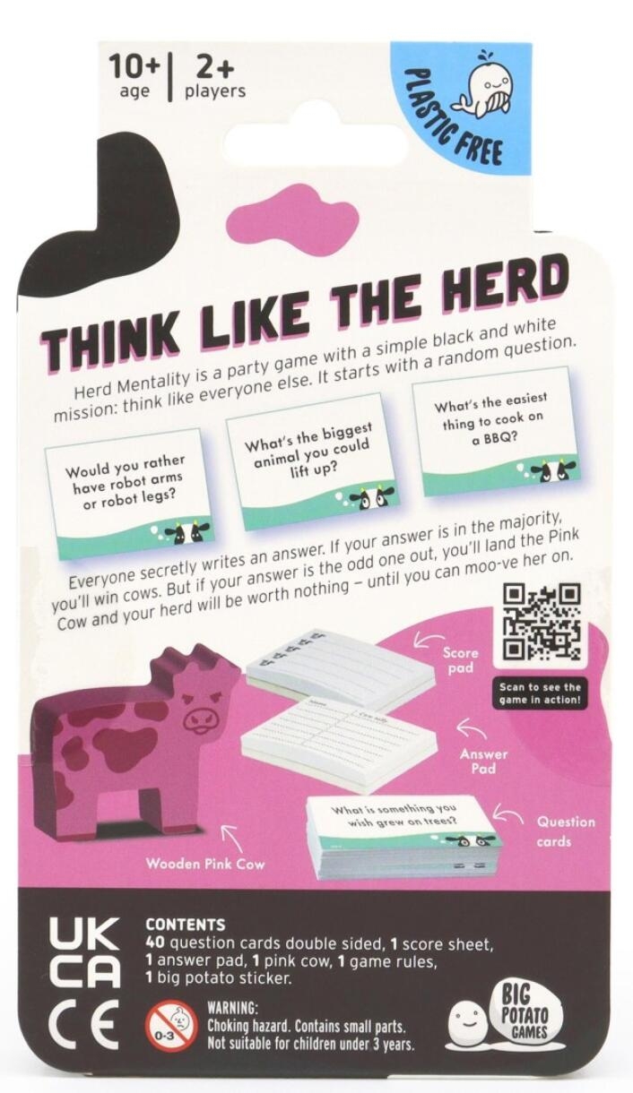 A pint-sized version of the classic game. Herd Mentality is a party game with a simple black and white mission: write down the same answer as everyone else. It starts with a random question, such as “What’s the hardest fruit to juggle with”. Then, everyone writes down an answer in secret. If your answer is in the majority, you win cows. But, if your answer is the odd one out, you’ll land the Pink Cow and your herd will be worthless — until you can pass her on to someone else!