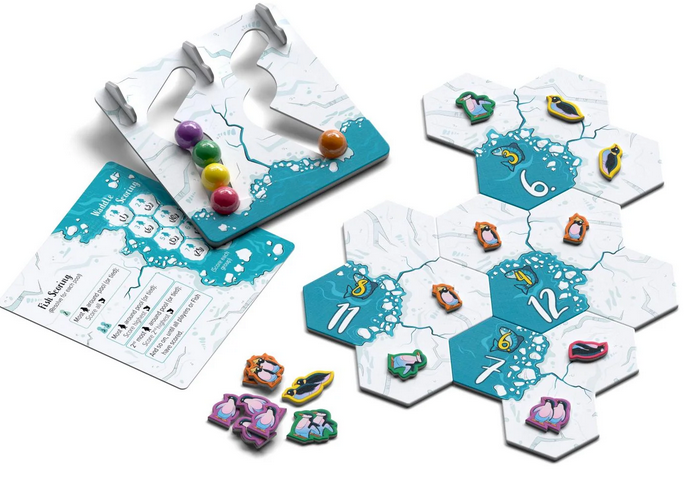 Strategically place your penguins to form groups and claim fish to score the most points! Turn order matters a lot; in Waddle, it’s tracked by marbles on a two-column track!