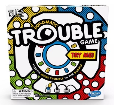 Trouble game is peg-popping fun, Pop-O-Matic die roller rolls the die, move your pegs around the board, Send other players' pegs home when you land on the same space, double Trouble and Warp spaces change up the game.