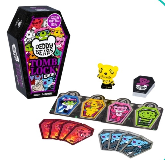 First player to complete all their sets wins!​ The Deddy Bear cards come packaged in a coffin shaped box! But not just that, the Deddy Bears Tomb Lock Game includes an exclusive collectible slow-foam Deddy Bear!
