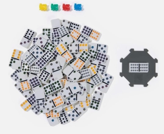 Double 12 dominoes with Mexican Train pieces all in a handy tin for storage.