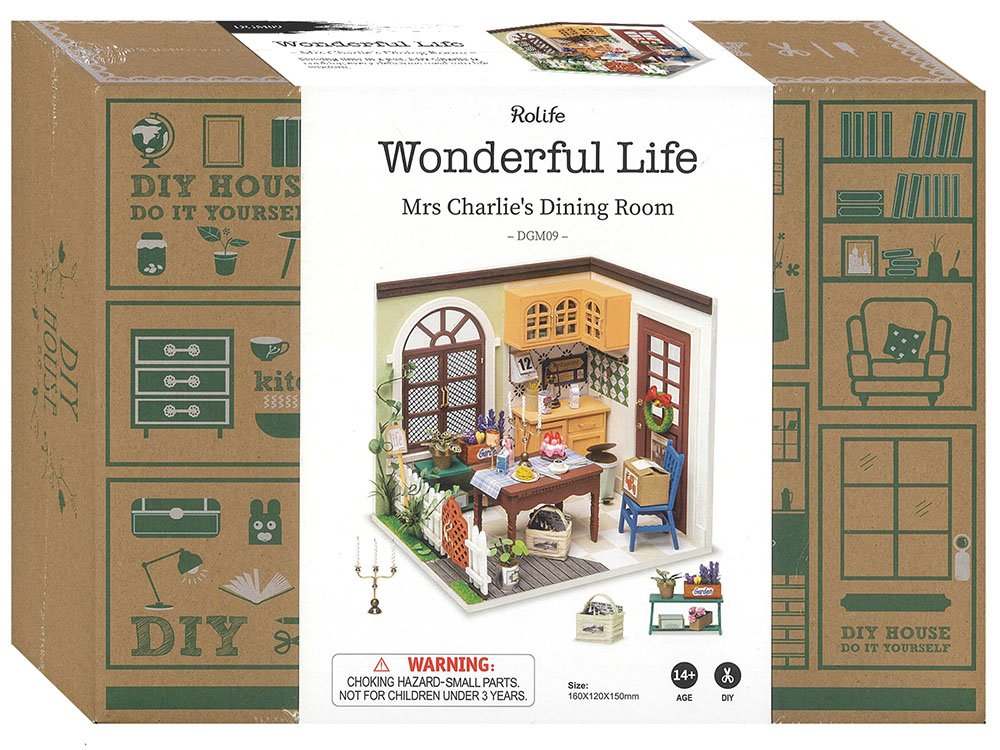 Robotime Charlie's Dining Room reproduces a small, busy but warm dining room. The flowers on shelf and goblet on table, unfinished speghetti all display a house full of love and life. Remind you of the lovely days when mom cook for you? Gleam step-by-step manual inside it. The kit is constructed of eco-friendly materials sufficient reason for no burrs.