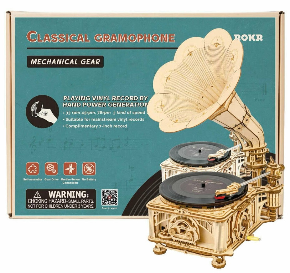Classic Gramophone. Which is inspired by the Gramophone invented by Thomas Edison. Retro design style with a vintage record player, It is not only just a model but also a gramophone that can really play records. With a hand crank.