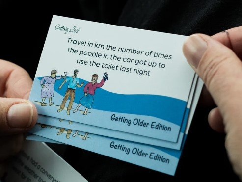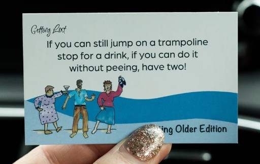 This game is filled with directions that only people over 40 will get. We've got everything from hip replacements to hot flushes - with a direction one way if you've had them, another if you haven't so every card is playable! It's hillarious and you'll learn a whole bunch of stuff you may or may not have wanted to know about the people you are travelling with! Bring the Poise - you'll need them!