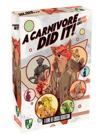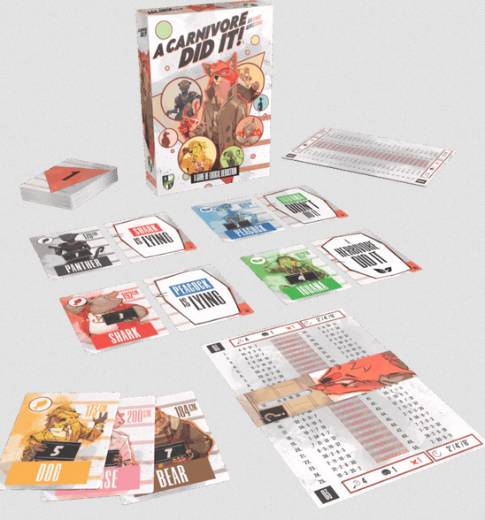 A Carnivore Did It  is a cooperative game for 1 to 5 detectives where you try to solve investigations using logic and deduction. Choose a case from a Dossier, prepare Suspects and Statements, and crank your brains into gear! Sift through tangled statements and hidden clues to unmask the true culprits: every lie you uncover brings you closer to justice. Can you solve the mystery?