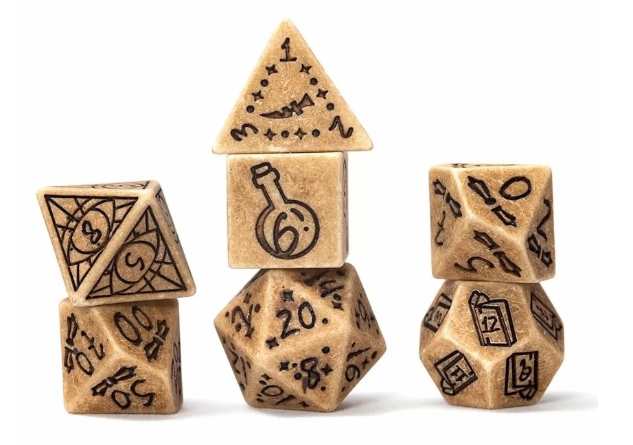 Dice wizardry at its best! The Illusory Stone 7-set polyhedral dice collection gives the aesthetic allure of stone with the lightweight and tactile sensation of resin! Every set showcases intricate glyphs and numbers with vintage charm.