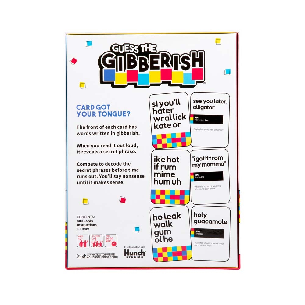 The front of each card has words written in gibberish. When you read it out loud, it reveals a secret phase. Compete to decode the secret phrases before time runs out. You’ll say nonsense until it makes sense.