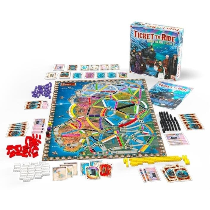 Ticket to Ride - Northern Lights™ is the next installment in the best-selling train adventure series. Players use their Train cards to claim rail or sea routes andconnect the cities listed on their Destination cards. In addition, they must keep an eye on the four, randomly selected, common objective cards that may grantthem precious bonus points at the end of the game. Designed for up to 5 players, this new Ticket to Ride™ game is elegant, can be learned in five minutes,and provides hours of fun for families and experienced gamers alike!