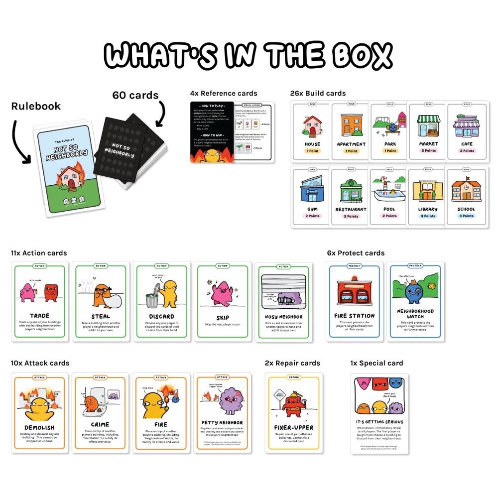 Not So Neighborly is a fun strategic card game, great for 2-4 players, that takes about 15-30 minutes to play and 5 minutes to learn.