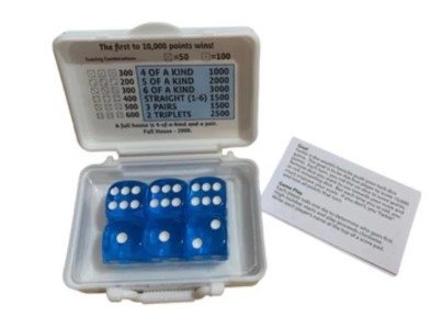 Farkle is a traditional push-your luck dice game similar to Dix Mille. Players roll six dice (or five, in some versions of the game), and remove any dice they want to use for points. They can stop, keeping the points, or re-roll the remaining dice. Points are scored by specific numbers (e.g. 5 or 1) or sets of the same number. If all six dice are used points, they can be picked back up and the player can keep going. The first player to 10,000 wins.