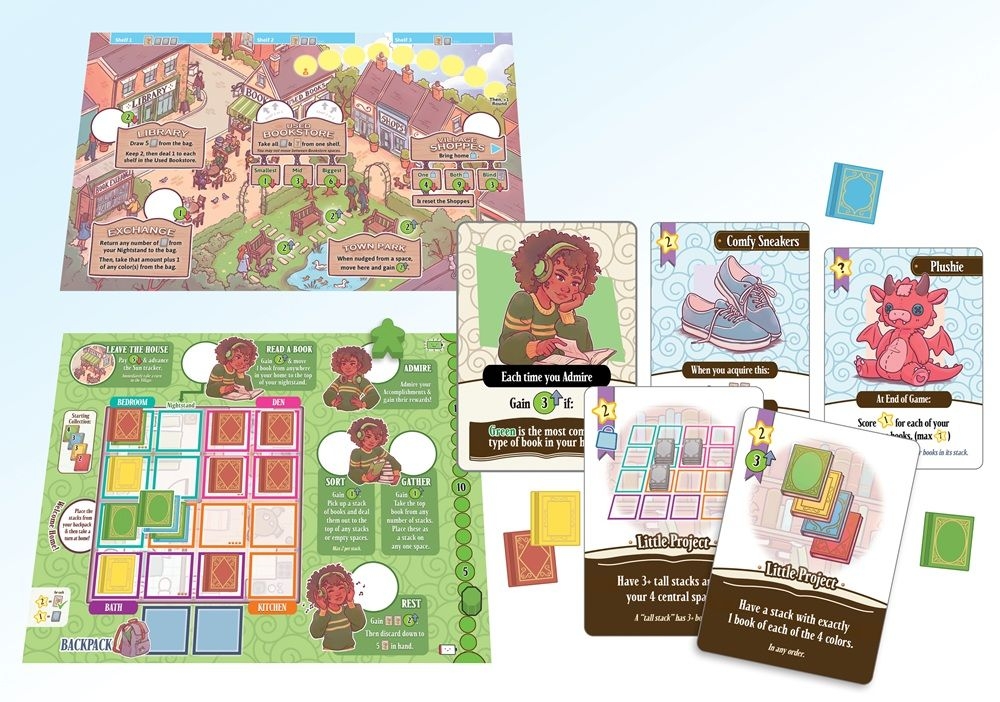 A Place for All My Books is a puzzley book gathering, sorting, and organizing game in which players arrange stacks of books in different rooms of their apartment as personal projects. When done, they can admire their accomplishments and gain their rewards – not least of which is renewed energy, which they can then spend to head out into the village...to pick up more books!