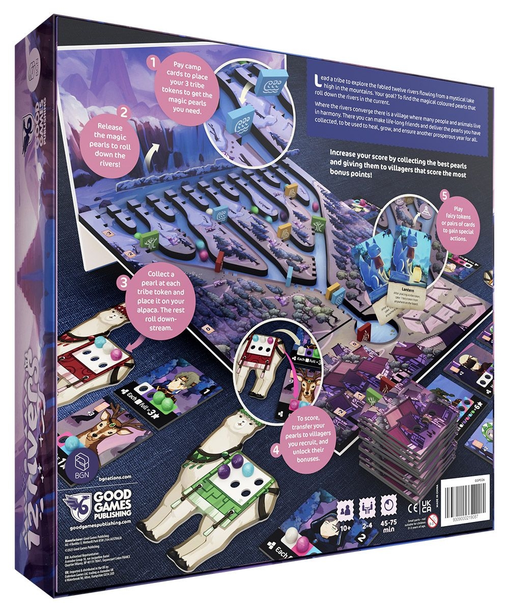 In 12 Rivers, players lead one of four tribes and take turns sending warriors to climb the mountain. The warriors camp near the river to collect Nature's bounties and bring these resources to villagers in need. Warriors can collect more valuable bounties if they move toward the origin of the river, but more camp tools have to be paid as well. After five rounds, the bounties to the villagers will be scored for players based on the rarity.