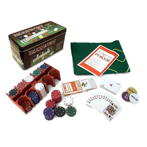 Contains 200 chips, 2 decks of cards, poker chip rack, Texas hold'em mat, and dealer button.